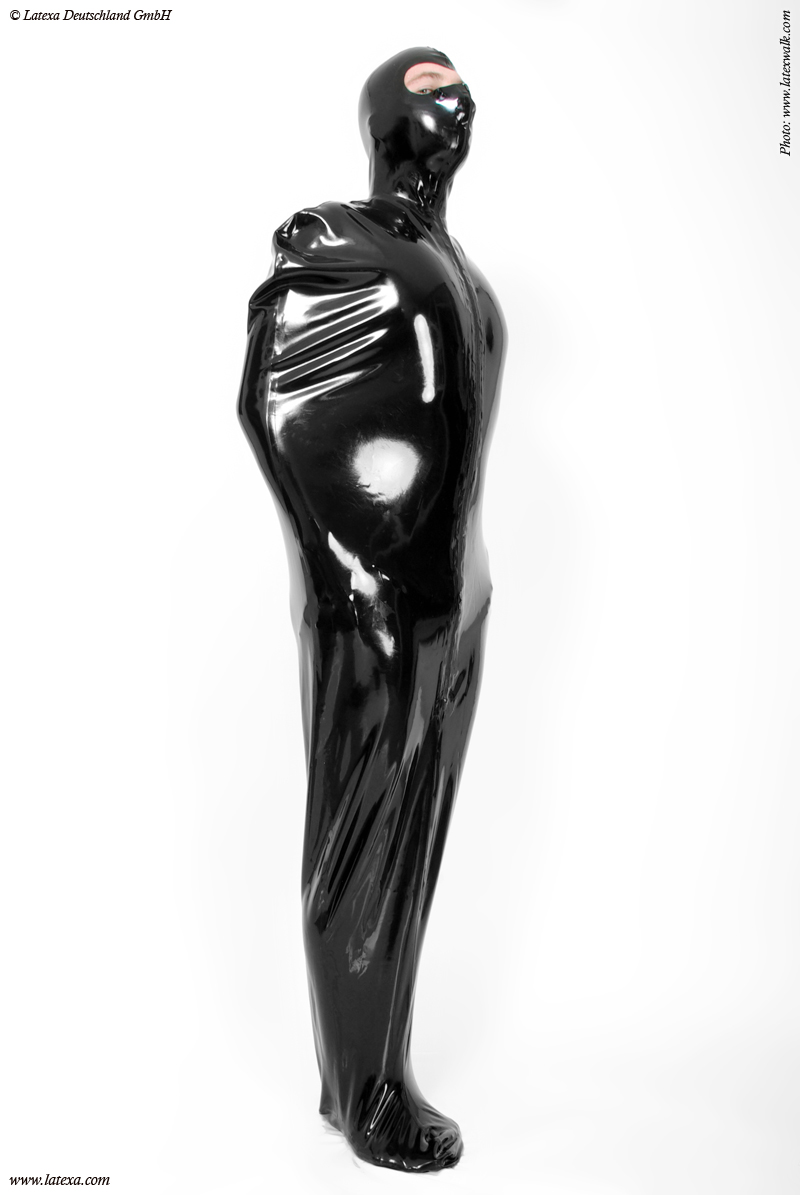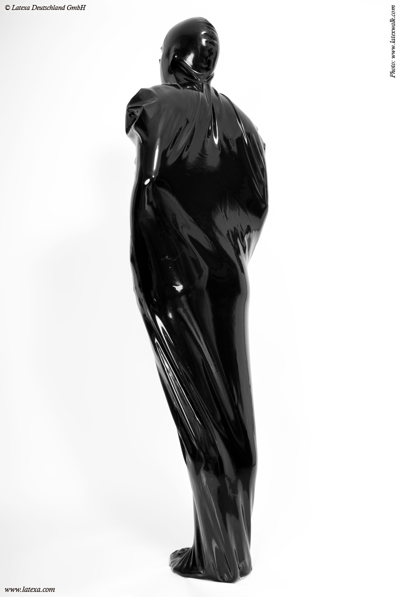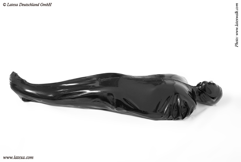 Bondage Schlafsack von Latexa mit vorn halboffener Maske.