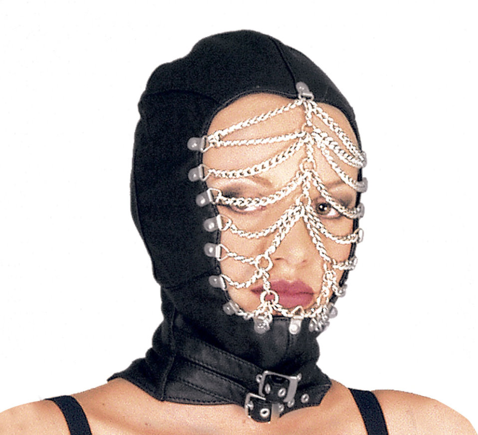 Stylische Maske/Kapuze von Ledapol ganz aus Nappaleder mit offenem, aber von Kettchen verhangenem Gesicht,