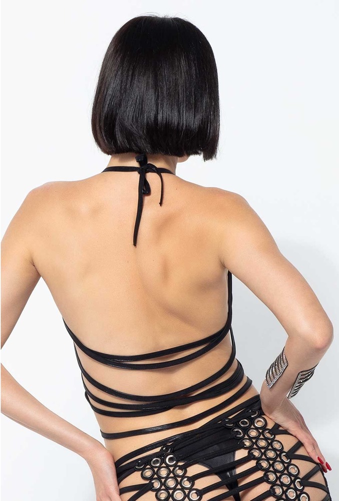 Schwarzes Riemchentop von Patrice Catanzaro, mit Teilen aus miteinander vernähten Ringösen.