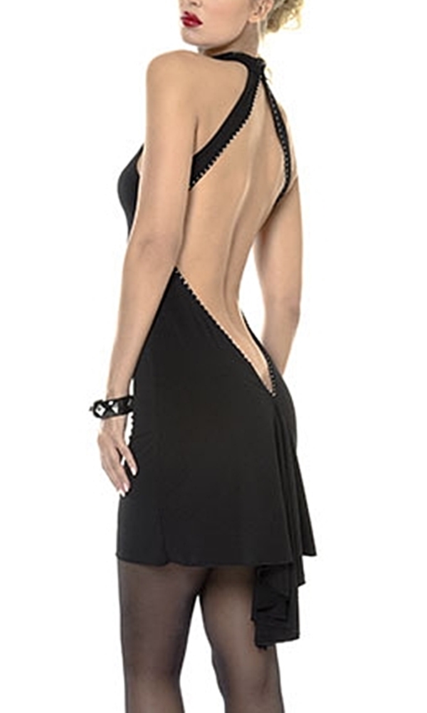 Reizvolles Minikleid von Patrice Catanzaro, hinten mit Riesen-Rückenausschnitt und schmalem, üppig langem Wasserfalleinsatz im Rockteil.